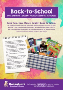 Save Time. Save Money. Simplify Back-to-School. Let Kookaburra take care of all the details and simplify Back-to-School for you! We offer a fully customisable Student Pack service with tailor-made Packs to suit every individual requirement as well as Bulk ordering for Back-to-School resources and items packed in class or year levels. Call us today 1300 766 997 or visit our website www.kookaburra.com.au • Save time and money by organising all your Back-to-School resources with one specialist education supplier. • Remove the complexity of administration work by engaging Kookaburra for all your resource requirements. • A unique solution for Back-to-School with customised inclusions specifically for your students and their parents. • High-quality products at competitive prices. • Secure online ordering of Student Packs through the Kookaburra website. Easy ordering and payment collection. No cash-handling. • A highly skilled sales team who can assist you in product selection and the entire ordering process. • Fantastic sales and customer service support to assist both teachers and parents with any enquiries. Back-to-School BULK ORDERING | STUDENT PACKS | CLASSROOM RESOURCES