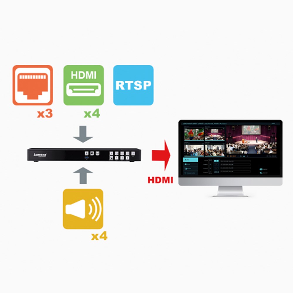 Lumens LC200 CaptureVision is an all-in-one media station. Very simple to operate, it's a video switcher, recorder, and streaming device. LC200 allows you to mix four video and computer sources to create engaging and attractive presentations and productions, complete with logo overlay, optional timestamp, and your choice of background. The system records each HD input independently (plus the program output) and uploads events, lectures, and conferences to your organization's Kaltura, Opencase, Panopto, or Wowza platform. It also streams live to users local and global over your preferred CDN, including YouTube, Twitch, Facebook, and Livestream. LC200 also integrates with applications such as Wirecast, vMix, and OBS Broadcast.