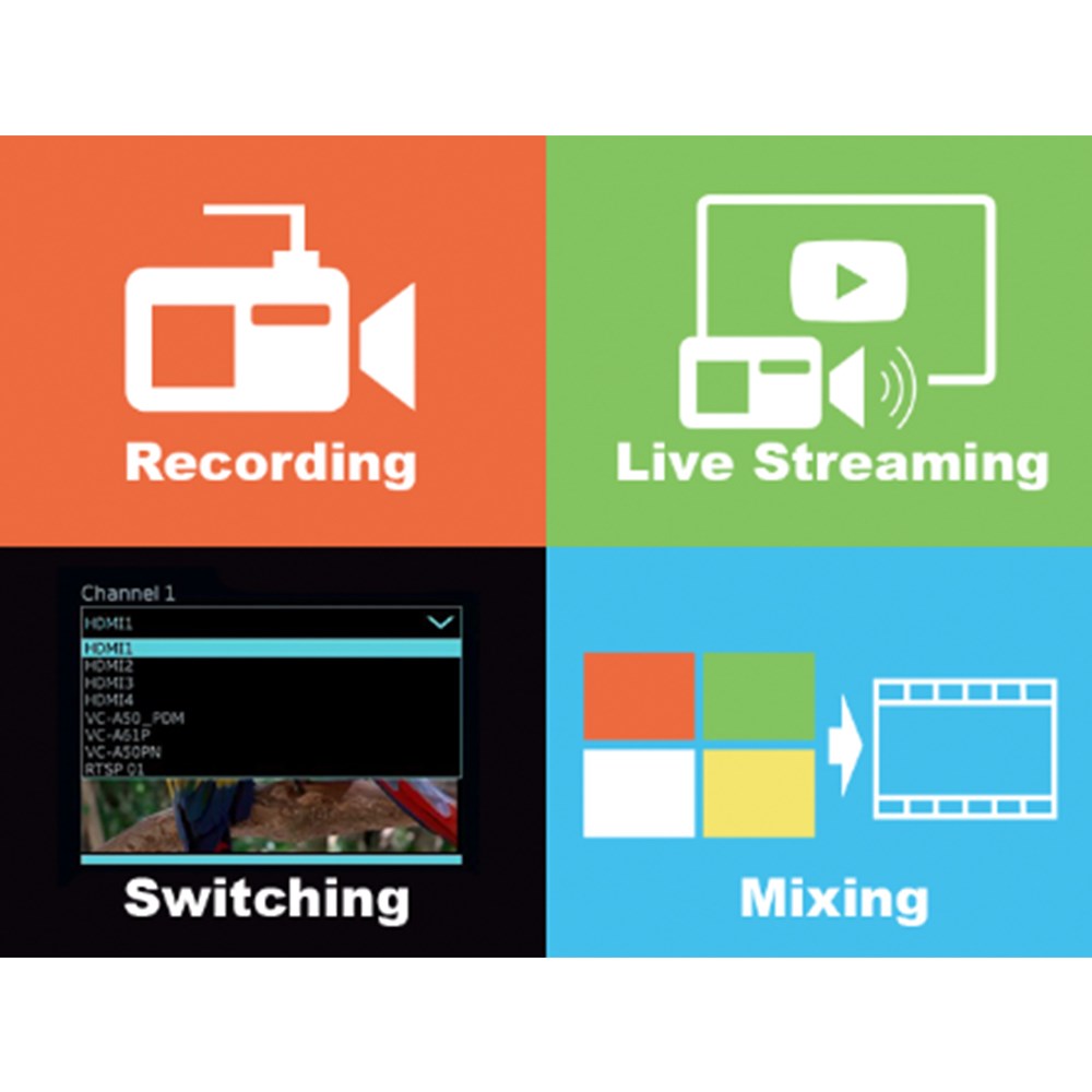 LC200 captures video from HDMI sources such as professional cameras, presentation laptops, decoders, and visualizers. The unit can also ingest video from standard IP cameras that support RTSP streams. HD-quality videos can be laid out dynamically with shots arranged side-by-side, picture-in-picture, or overlaid – the choice is yours. Layouts can be saved as templates, giving each production consistency and simplifying the production process for the operator. Audio embedded in video inputs can be mixed with the line-in jacks to provide you an excellent level of audio control.