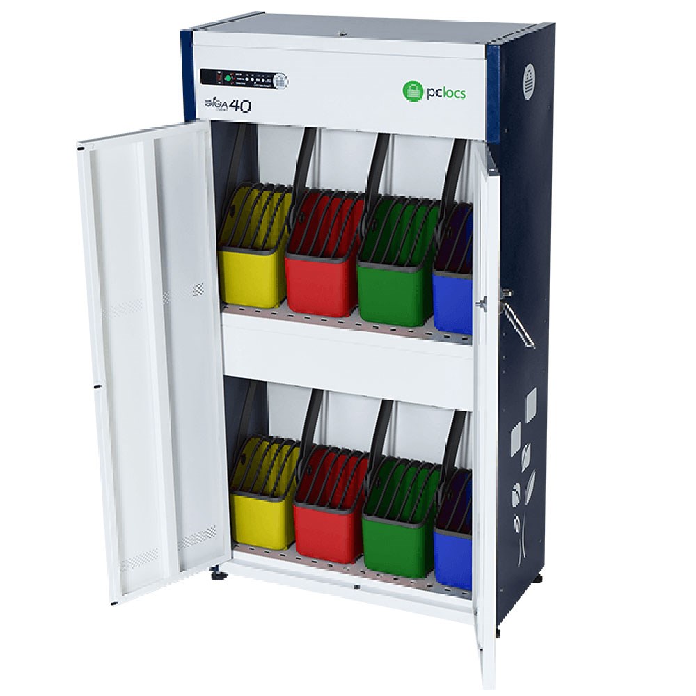- Charge up to 40 laptops or tablets in one streamlined cabinet.